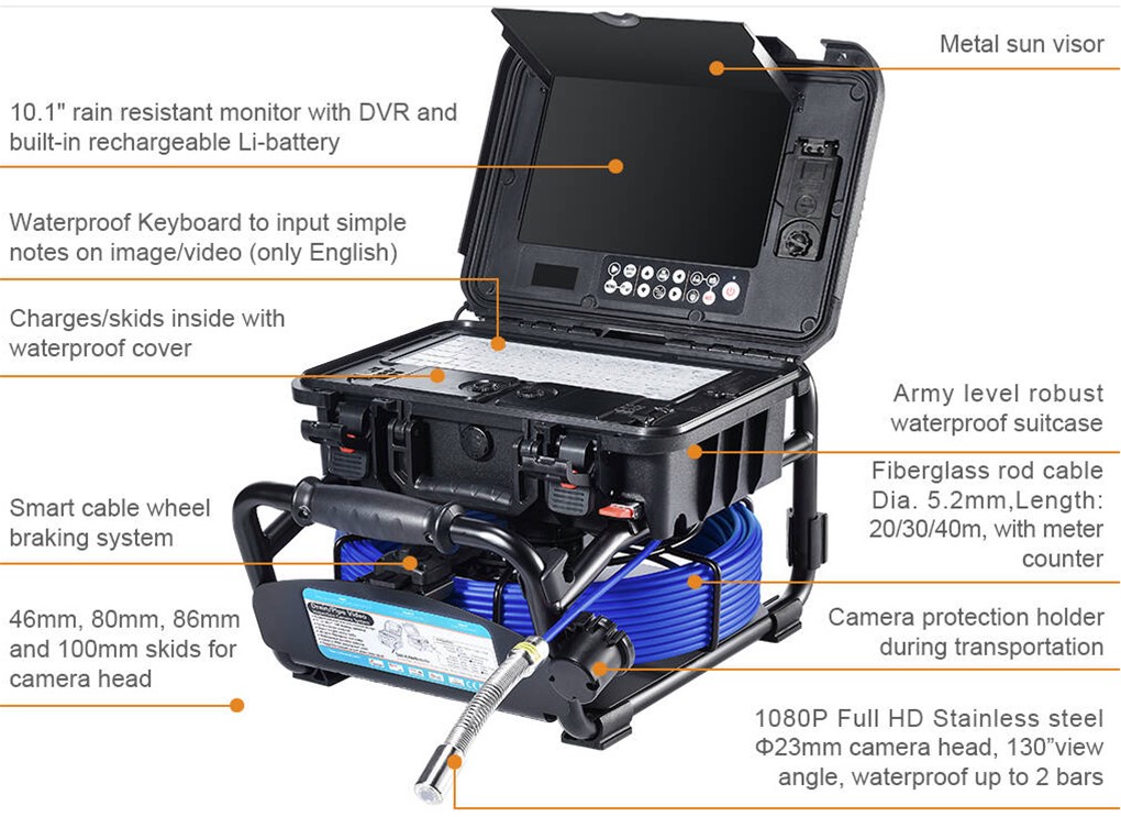 Rain-Proof professional video inspection camera designed based on best seller CSL3499F & CSL3499FB, for inspection of sewer, pipe, air ducts, underground cable pipes, etc.. Equipped with a 1080P AHD 23mm camera head, 40m fiberglass push cable and 10'' LCD monitor with SD card recording, best choice for pipe DN 30MM - 150MM. Can be used in any weather, rain or shine!