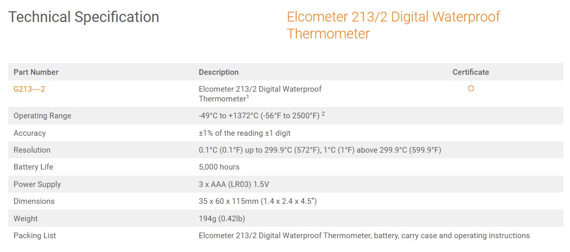 The Elcometer 213/2 Digital Waterproof Thermometer is simple and easy-to-use for quick and easy measurements of the surface, air and liquid temperature as well as the temperature of soft materials