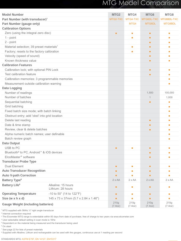 As well as all the features of the MTG2, the MTG4 has two calibration options. Using an uncoated sample of test material of a known thickness, the gauge can be calibrated using 1-Point calibration. Alternatively, the user can select one of 39 pre-set materials stored within the gauge including; aluminium, steel, stainless steel, cast iron, plexiglass, PVC, polystyrene and polyurethane.