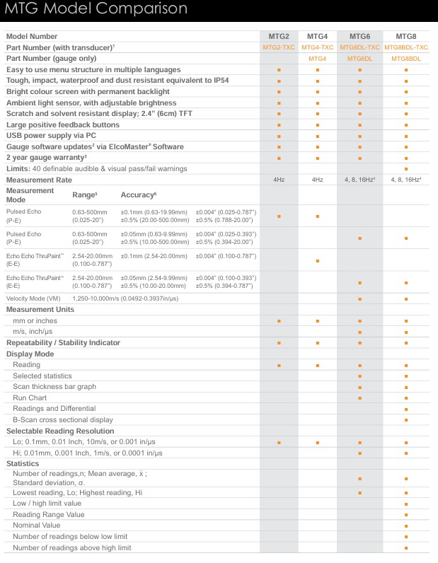 The MTG2 is supplied complete with 5MHz, ¼” transducer and is pre-calibrated for measuring on steel only with a thickness range of up to 500mm (20”) in Pulsed-Echo (P-E) mode. Compatible with ElcoMaster® software, individual readings can be downloaded via USB to PC or similar device for further analysis.