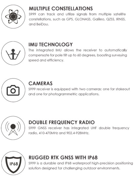 Equipped with an integrated 4G modem and a 1-Watt UHF radio with 410-470 MHz and 902.4-928 MHz frequencies, the S999 ensures constant connectivity and long working range. The advanced IMU technology allows tilted measurements up to 60° with fast initialization, increasing field productivity by up to 40%. Weighing only 1065 grams and with an IP68 protection rating, the S999 is robust and easy to handle even in extreme environmental conditions, with an operating temperature range between -40°C and +65°C. The internal battery provides over 10 hours of autonomy, while the 32 GB of integrated memory offers ample storage space.