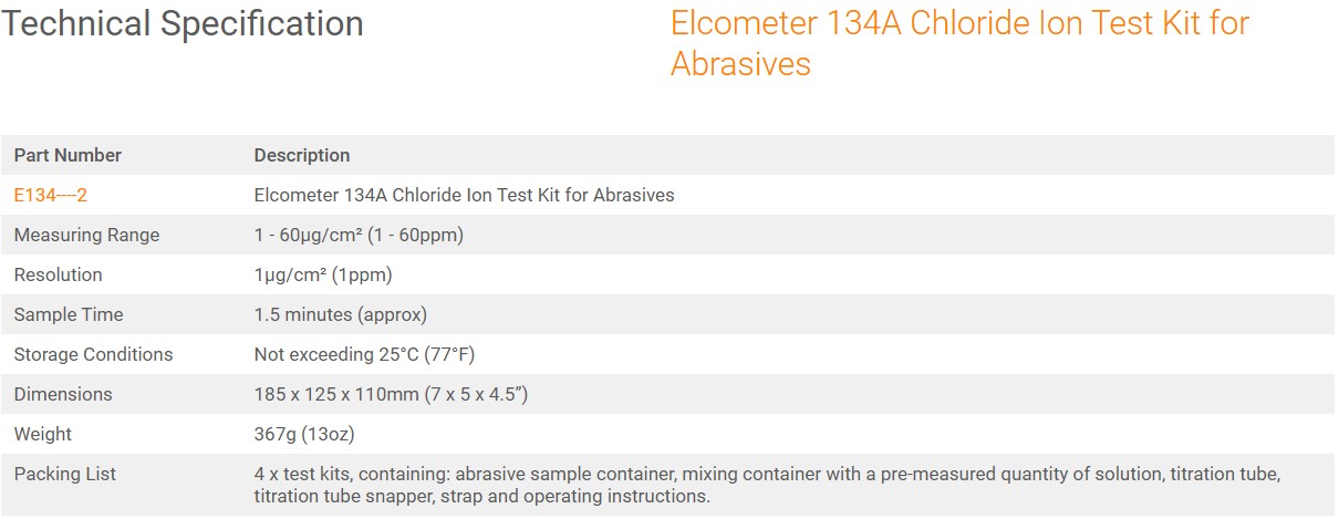 The Elcometer 134A Chloride Ion Test Kit for Abrasives is used to test the recycled abrasives for the presence of chloride salts that may contaminate the cleaned surface.