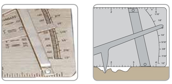 The gauge is placed horizontally on the surface of the pipe and the stylus is positioned into the base of the corrosion pit.