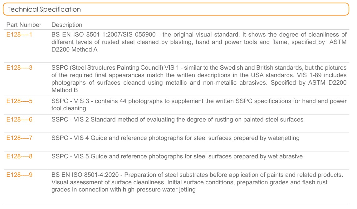 Elcometer 128 Pictorial Surface Standards are high quality photographs which are used for comparison purposes to assess the visual appearance of a steel surface.