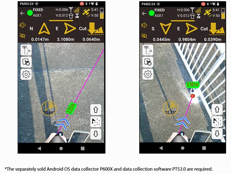 All three models of the GX are equipped with cameras for AR stakeout. The cameras capture the ground beneath the receiver and display the footage in real-time on the data collector's screen. The screen shows the direction and distance to the stakeout points, visually guiding the surveyor.