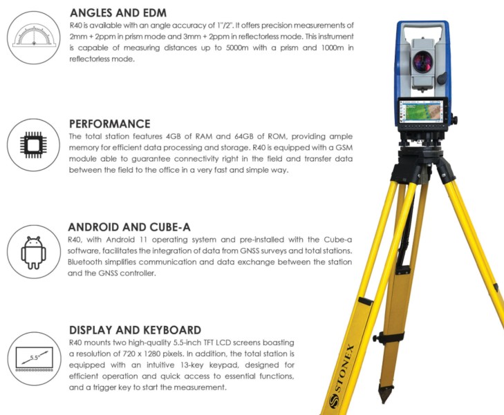 R40 is a mechanical total station featuring Android 11 Operating System and equipped with Cube-a software on board. Designed for accuracy and efficiency, it is available in two versions with 1“/2” angular accuracy, and features accuracy on distance measurements of 2mm + 2ppm in prism mode and 3mm + 2ppm without prism.